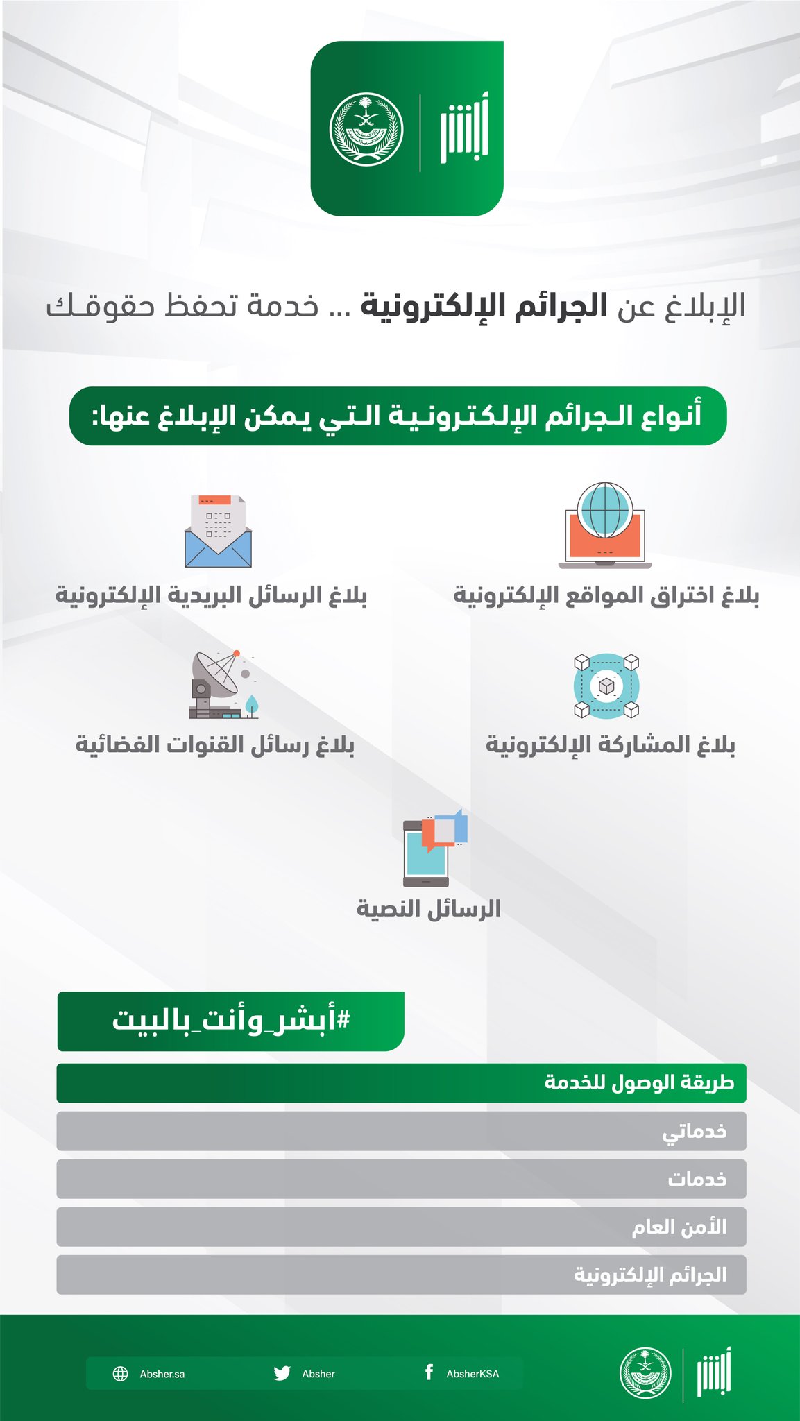 أبشر On Twitter خدمات أبشر الإلكترونية تشمل خدمة الإبلاغ عن الجرائم الإلكترونية Https T Co Snpbew6yzq أبشر وأنت بالبيت