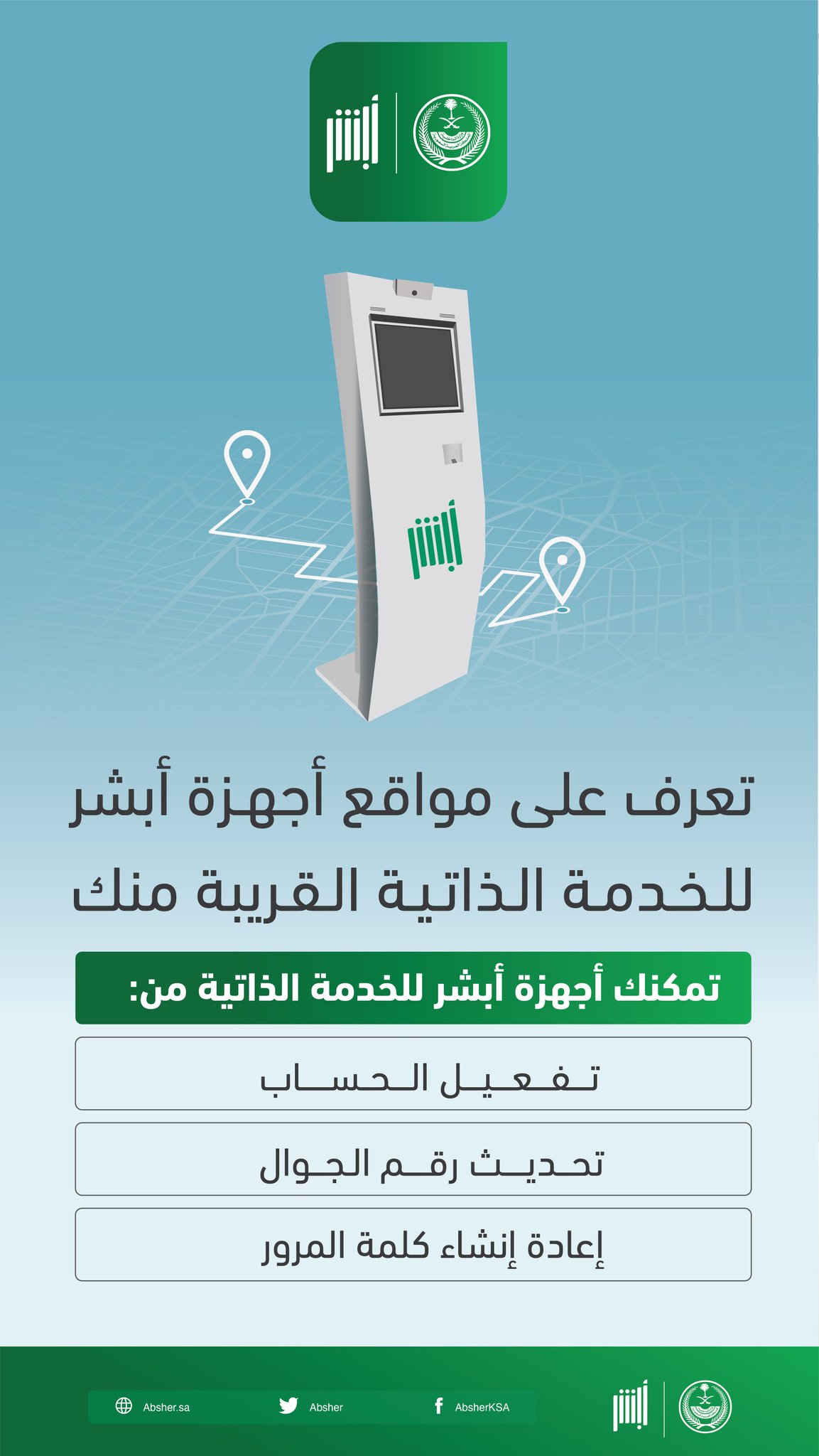 أبشر On Twitter تتيح لك أجهزة أبشر للخدمة الذاتية تفعيل الحساب وإعادة إنشاء كلمة المرور بالإضافة إلى تحديث رقم الجوال تعرف على أقرب جهاز لك عبر الرابط التالي Https T Co Vhy6wbghjg Https T Co 2vpstbnefy