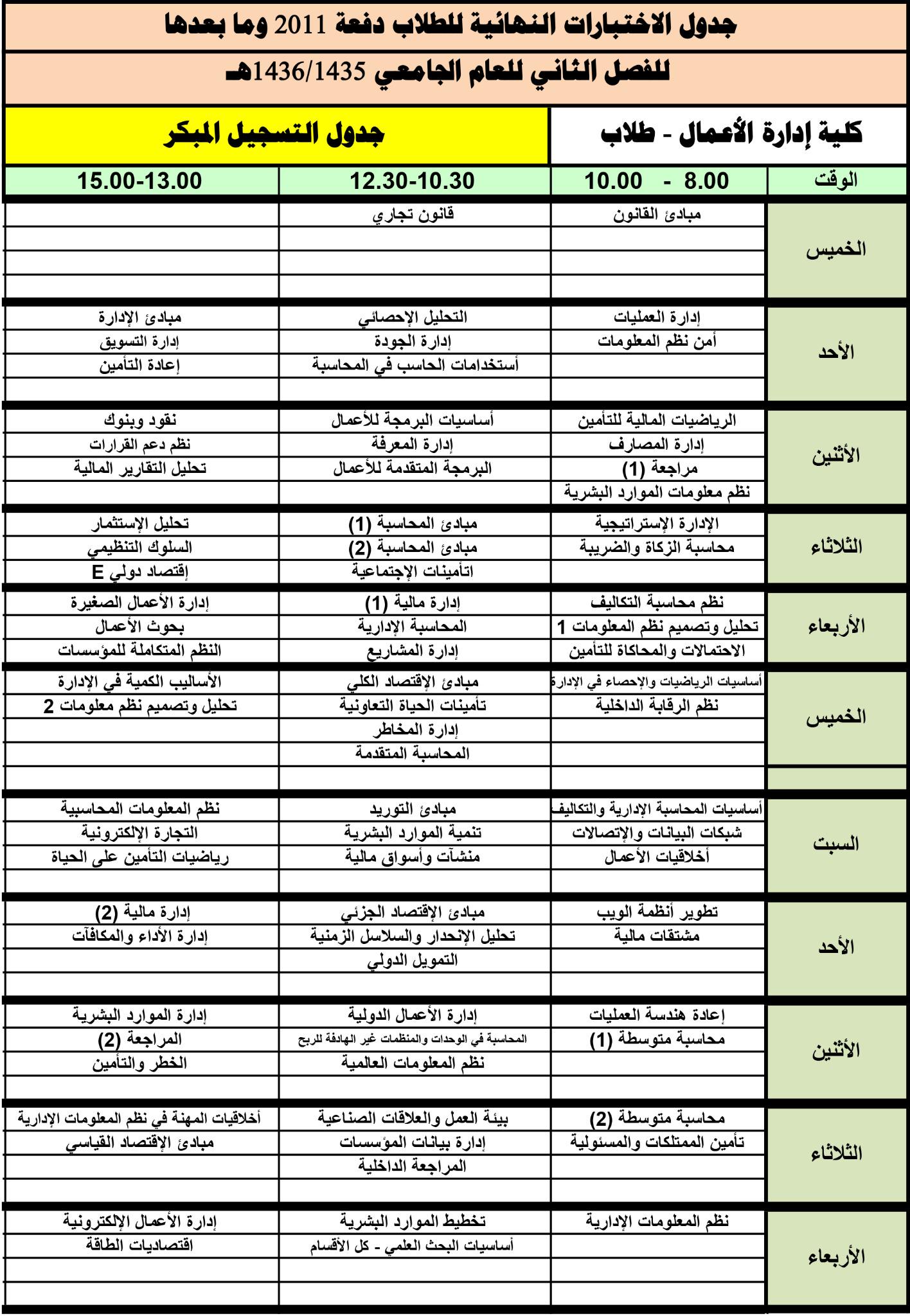 كلية إدارة الأعمال No Twitter جدول الاختبارات النهائية للطلاب دفعة 2011 ومابعدها للفصل الثاني للعام الجامعي 1436 1435هـ جدول التسجيل المبكر Http T Co Udbe5rmj02