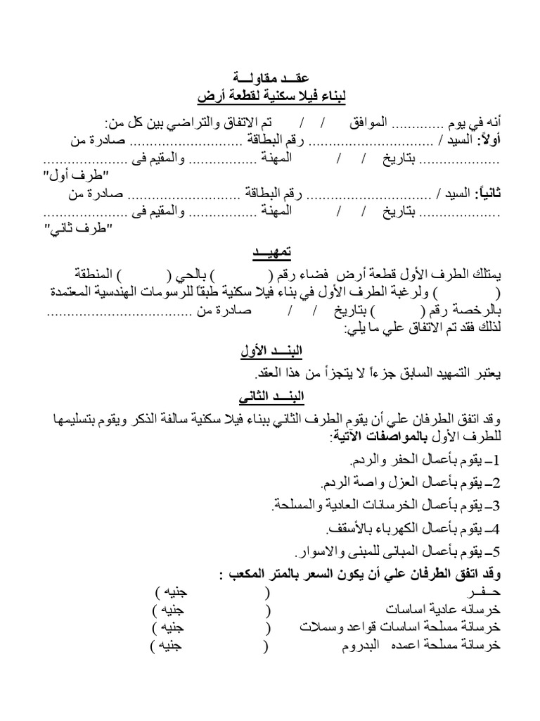 عقد مقاولة بناء صيغة عقد اتفاق بين طرفين مقاولات